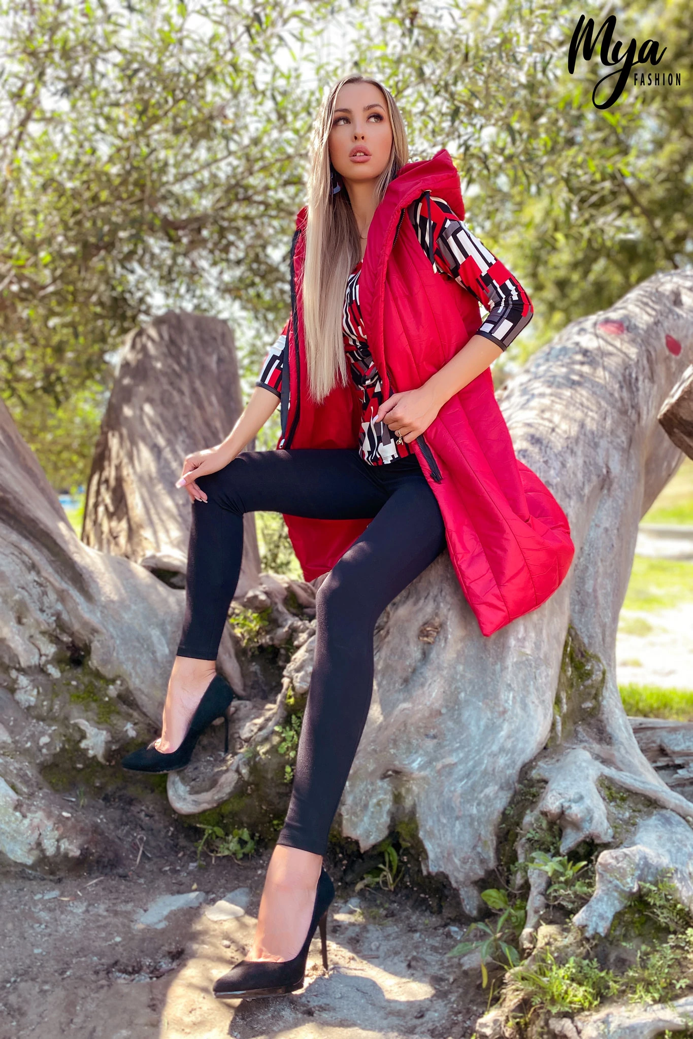 Szteppelt, ujjatlan mellény. Oldalain zsebekkel, gallérján ringlis megkötővel. Kapucnis kivitel. Elején hosszanti cipzárral záródik. |