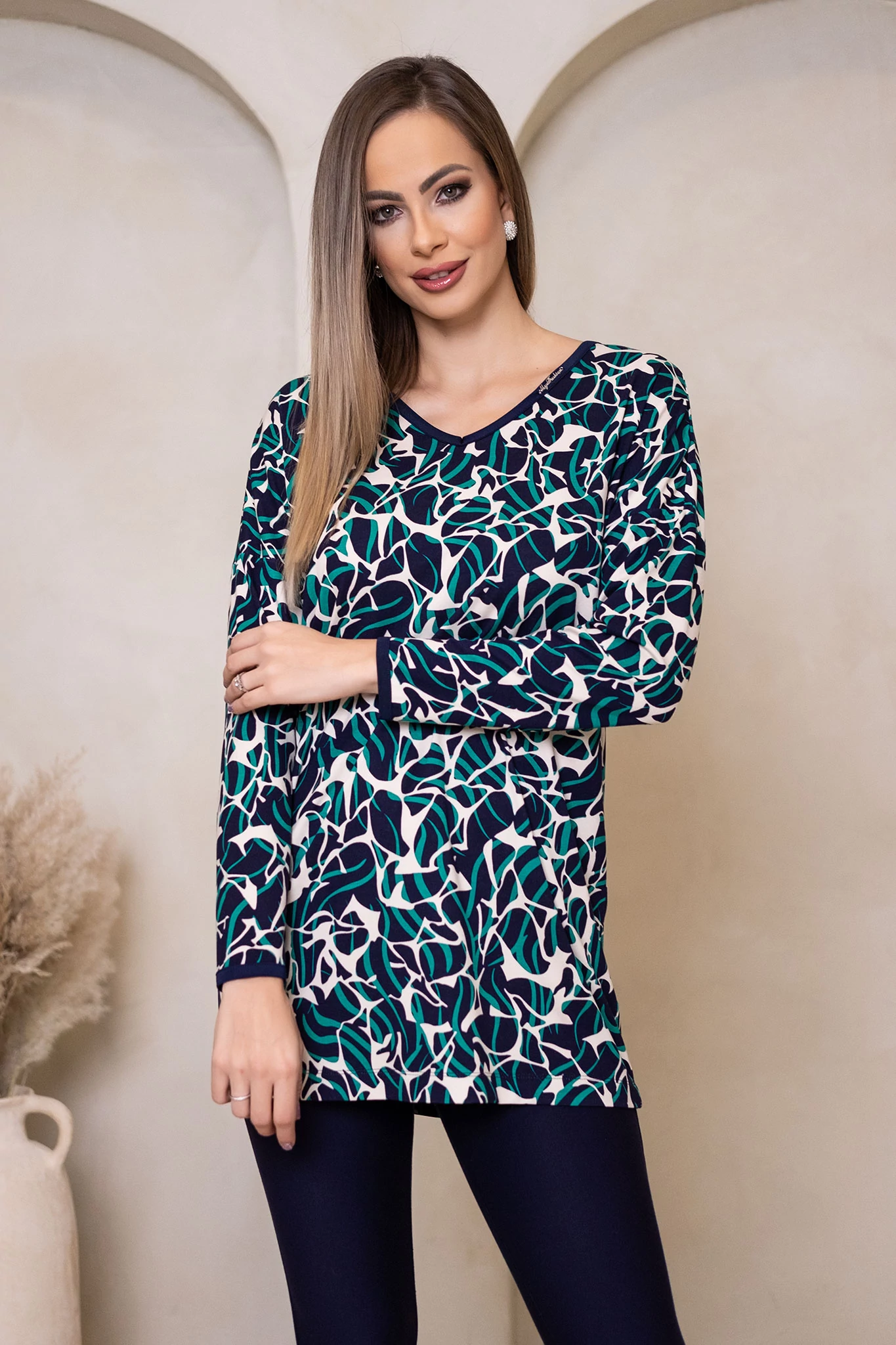 Laza szabású,ejtettvállú tunika, hosszú ujjakkal.