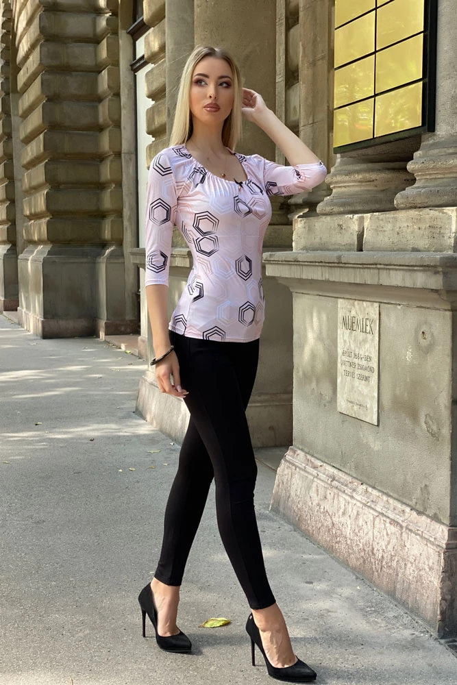 Testhezálló fazonú, 3/4-es ujjú felső. Csónaknyaka elegáns ékbetéttel díszített, ujjai passzéban végződnek.