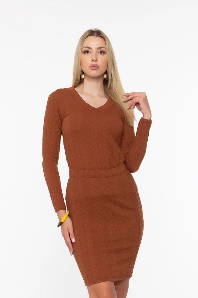 Testhezálló fazonú szoknya, vastag, csavart mintájú kötött anyagból. Dereka gumis.
