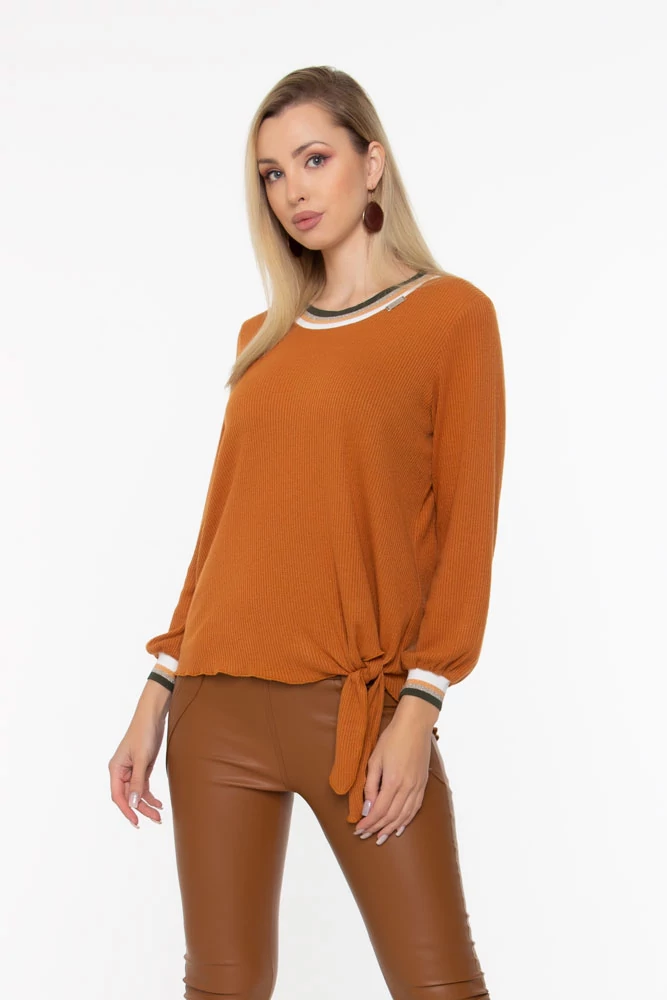 Laza szabású, vékony, kereknyakú pulóver, alján kötőkével. Anyagösszetétel: 95% viszkóz, 5% elasztán |