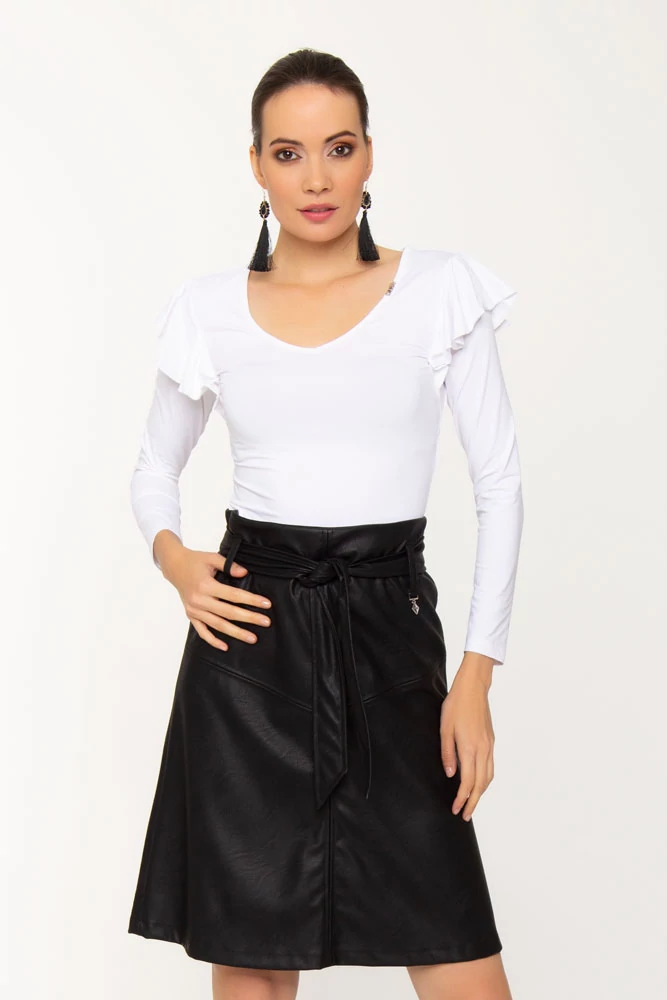 Testhezálló fazonú "V" nyakú póló, vállain fodorral. Anyagösszetétel: 95% Poliamid, 5% Elasztán |