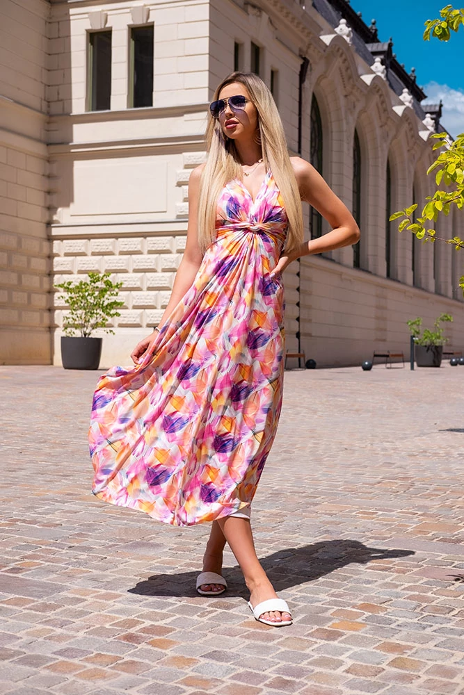 Lágyesésű, csavart dekoltázsú maxi ruha - mintás