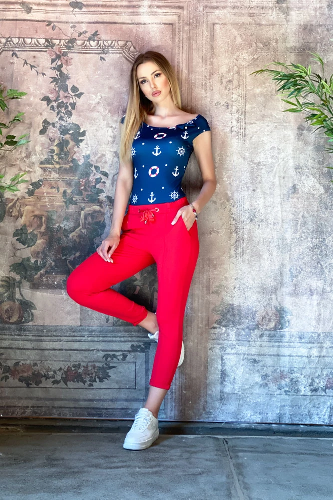 Laza szabású, gumisderekú nadrág, elöl zsebekkel. Szárai lefelé szűkülnek, derekát kis megkötő díszíti.