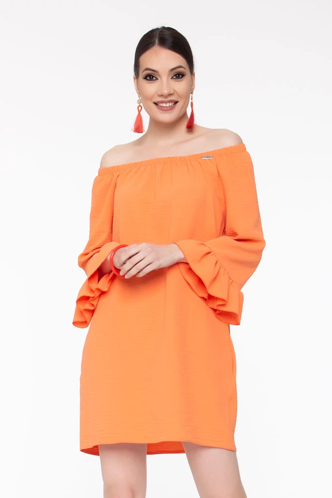 Szűk fazonú mini ruha, rövid ujjakkal és "V" nyakkivágással.