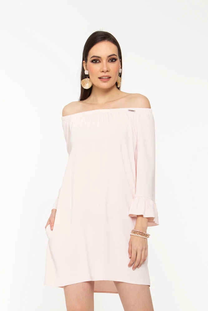 Szűk fazonú mini ruha, rövid ujjakkal és "V" nyakkivágással.
