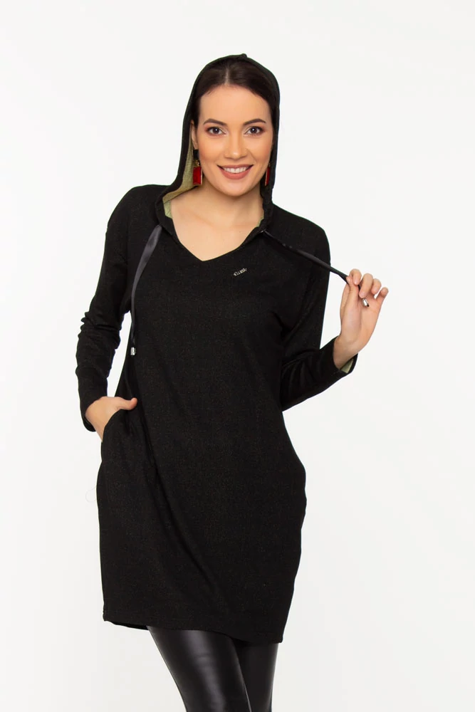 Ejtettvállú, lezser szabású extra puha pulóverruha, oldalán felsliccelt, cipzárral záródó. Kapucnija ringlikkel és megkötővel díszített.