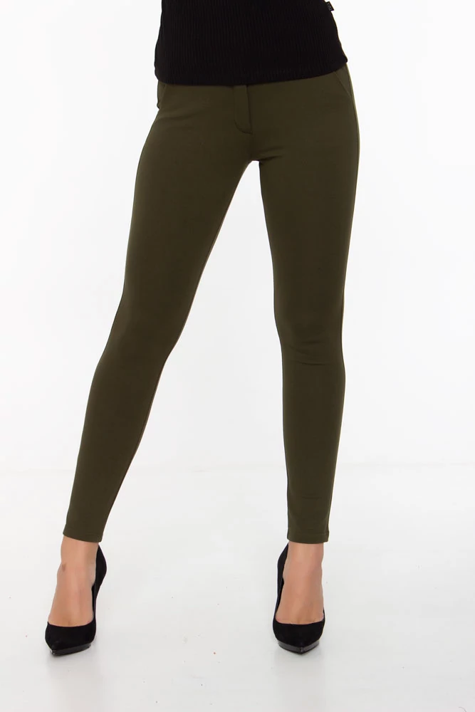 Szűk fazonú, gumis derekú, bőrhatású nadrág,farzsebekkel.