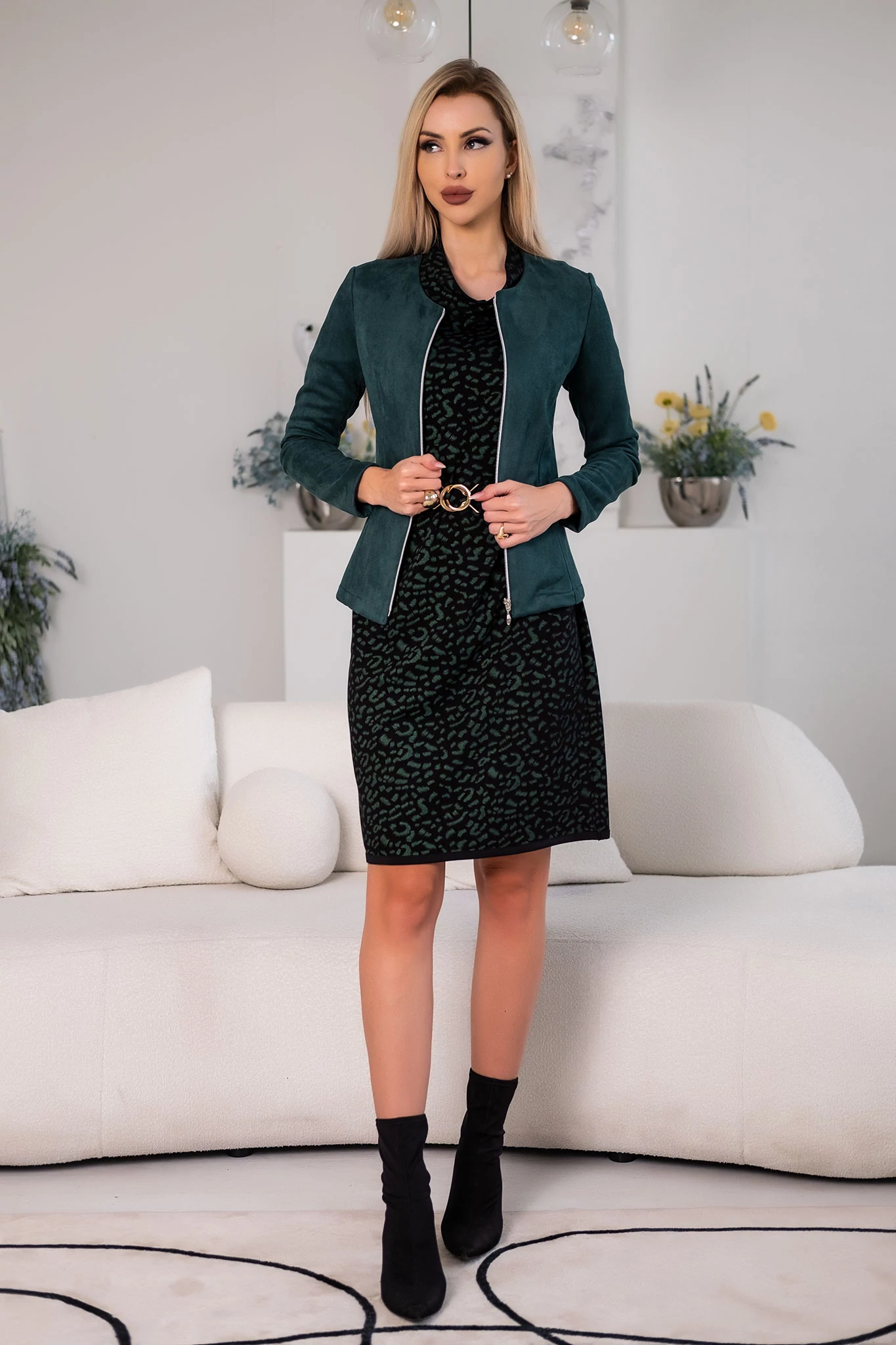 Stílusos, lezser fazonú ruha fekete-zöld ocelot mintával. 3/4-es ujjai és apró félgarbó nyaka modern, nőies megjelenést kölcsönöznek. Kényelmes, térd fölé érő hosszúságával tökéletes választás mindennapi viseletre vagy hétvégi/esti programokra. |