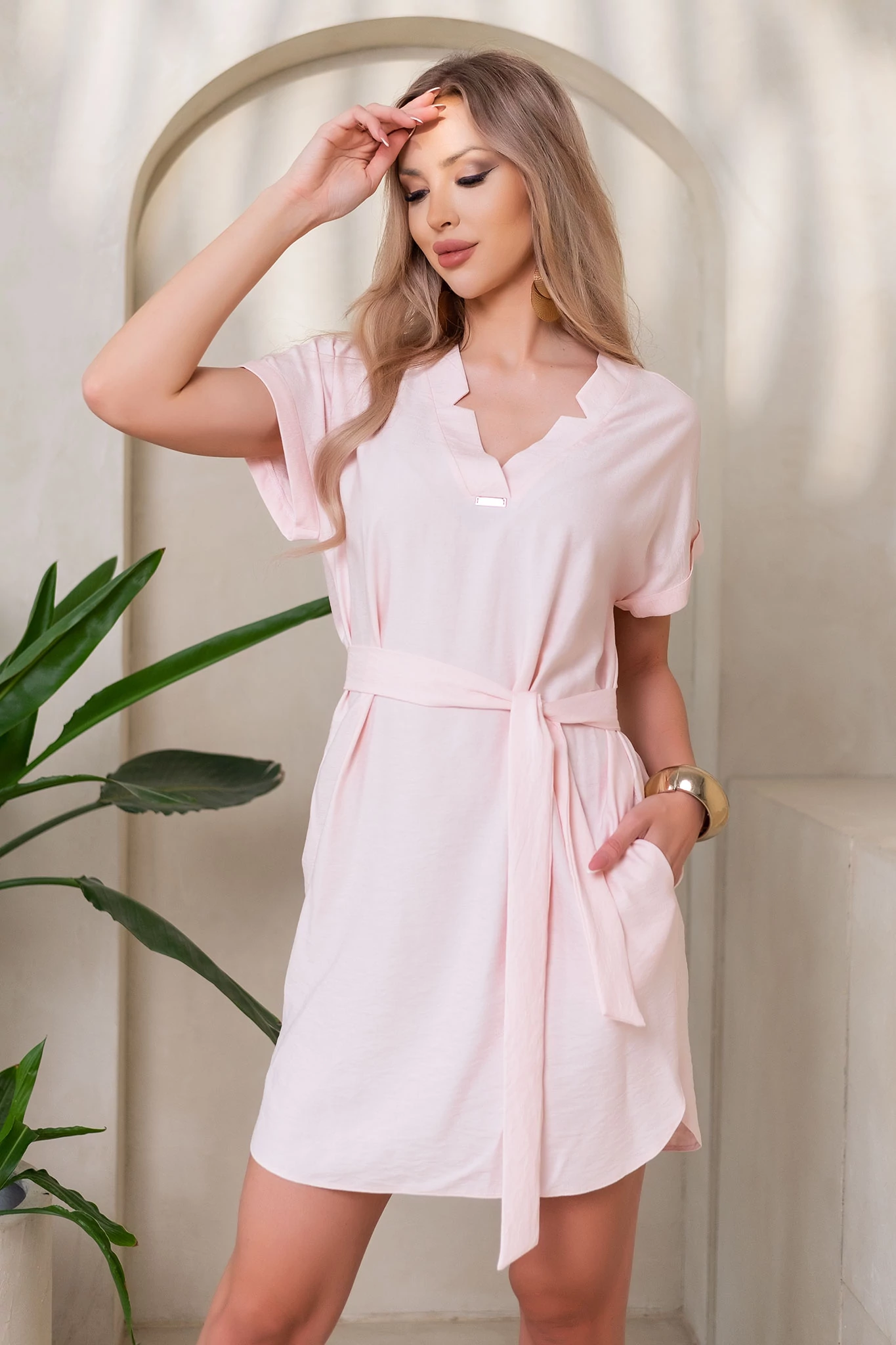 Rövidujjú galléros ruha, dekoltázsán gombokkal zárható. Derekán vékony övvel megköthető, szoknyarésze "A" vonalú.