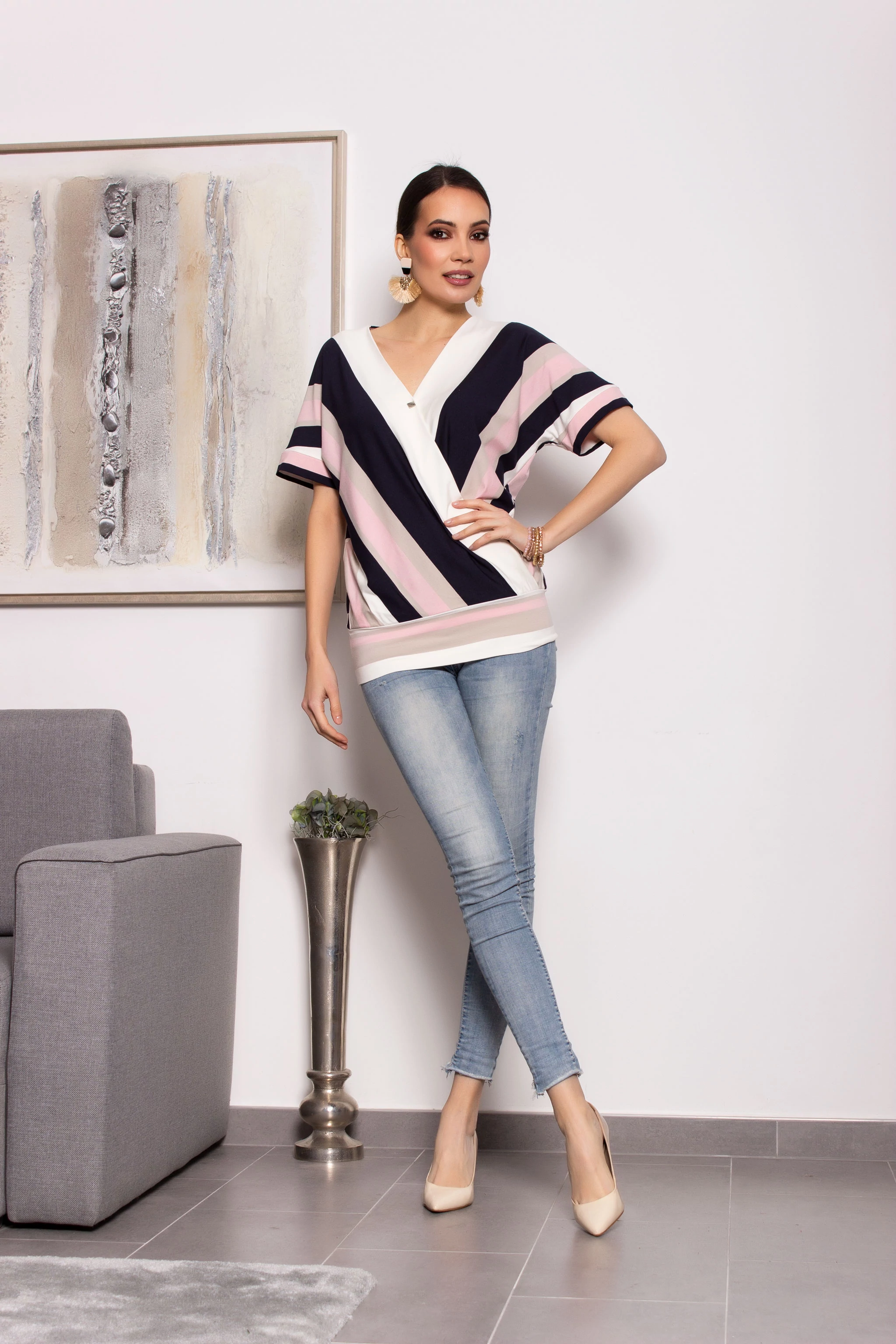 Laza szabású átlapolt tunika, rövid laza ujjakkal. Anyagösszetétel: 95% viszkóz, 5% elasztán |